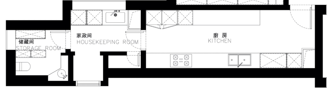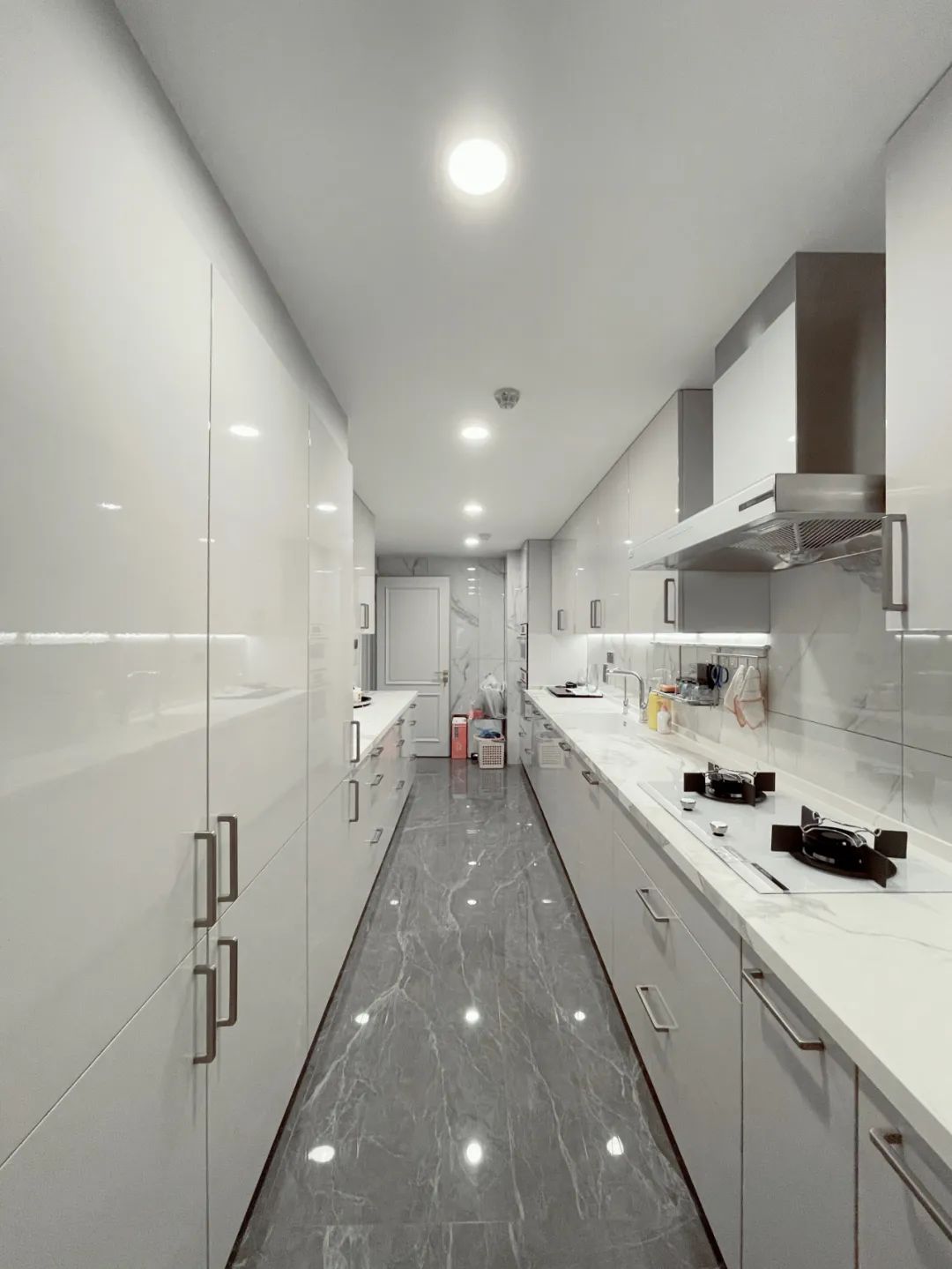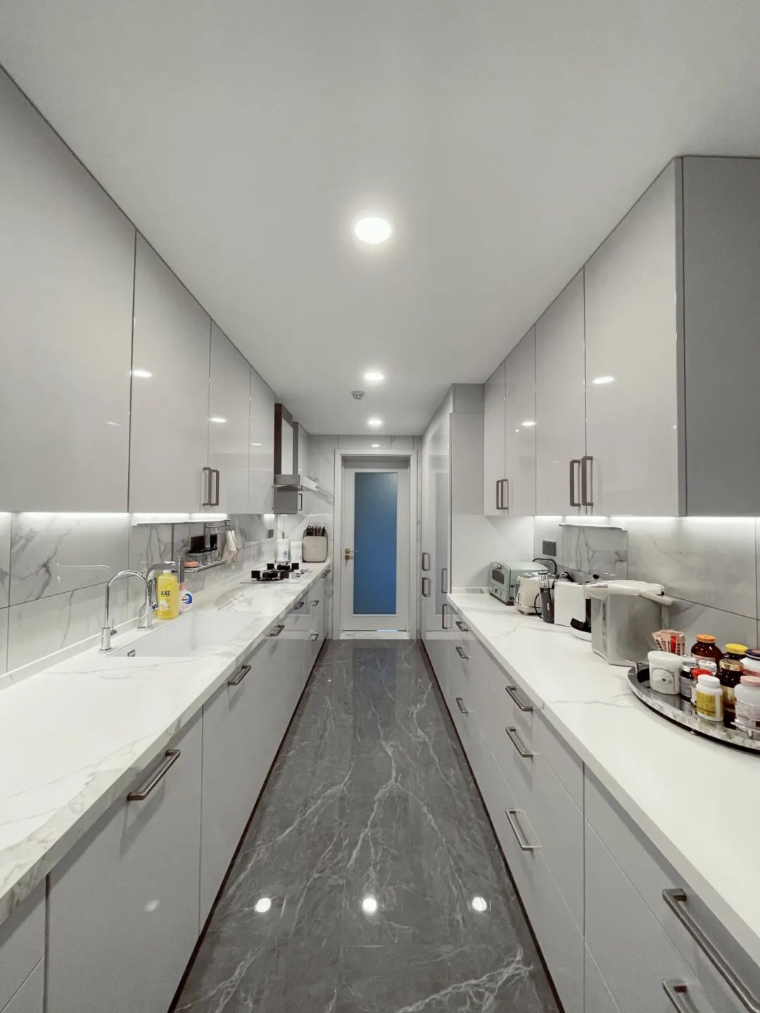 因为厨房没有窗户,就没有自然光线,所以室内空间用明亮的材质打底,全部柜体也采用白色调,整体提亮不压抑。厨房空间与家政间、储藏间一字相连,厨房与家政房仅一门之隔,只要打开家政间,也可以确保这个空间的通风换气。