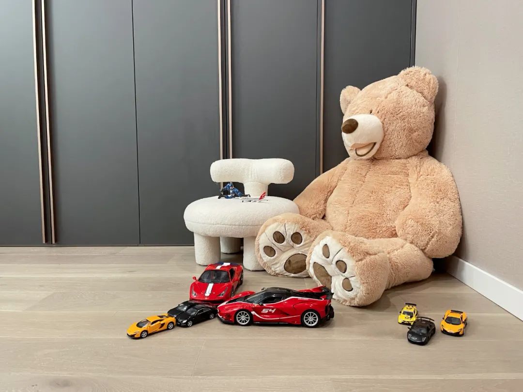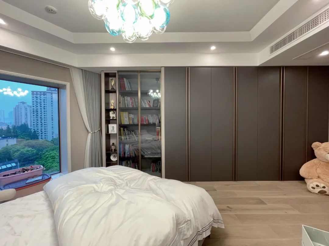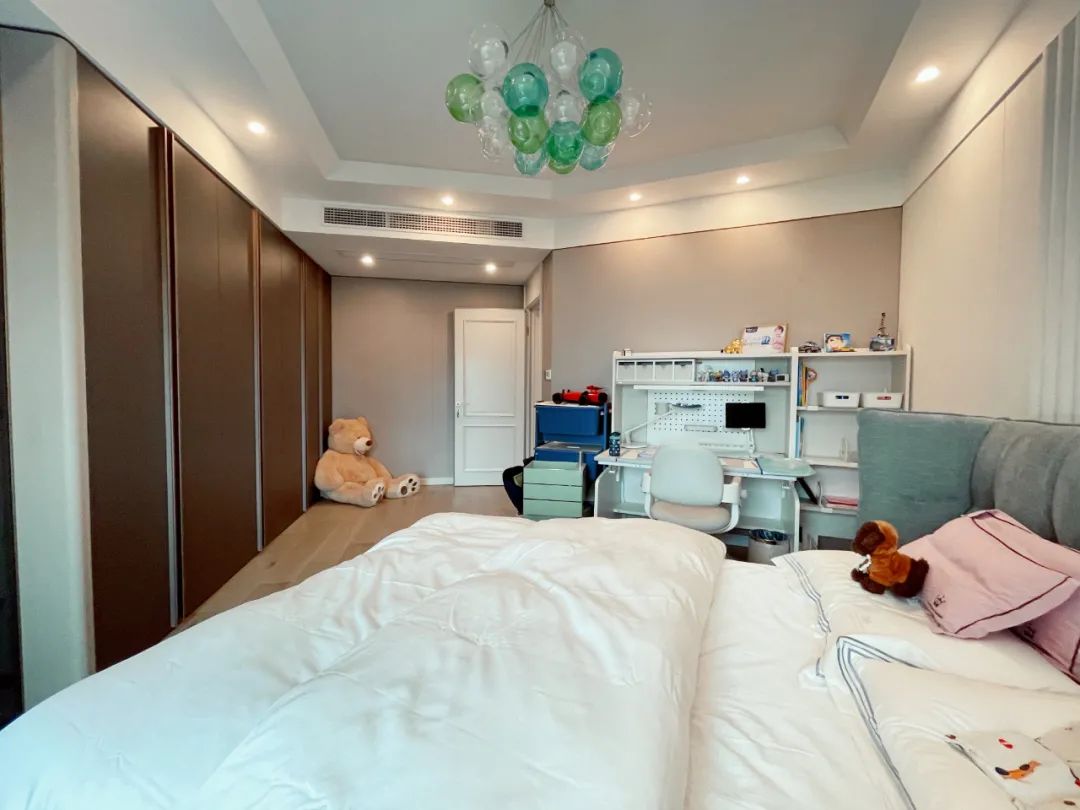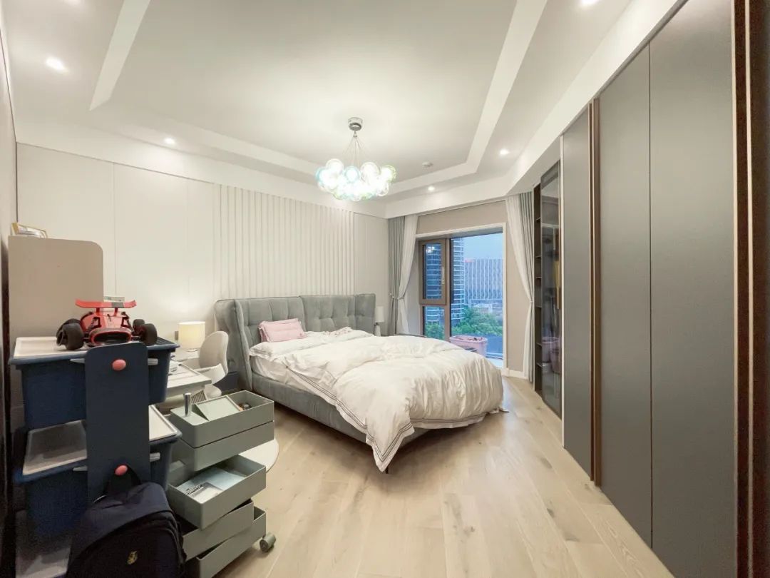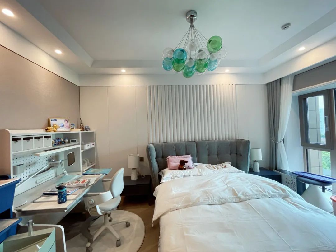 除主卧外,本案另外还有两个次卧,分别是业主一双儿女的房间。首先是这间以灰白色调为主的极简卧室,是业主儿子的房间。男孩子好奇心强、玩具多、物品多,因此收纳空间马虎不得,儿子房将一整面的墙面打造成衣柜空间,买再多玩具、潮鞋、潮服也不怕放不下了。床一侧是学习区,书架书桌一体化的设计给予了孩子充足的学习空间,拥有这样功能丰富、空间开阔的专属空间内,学习也变得更有动力了。