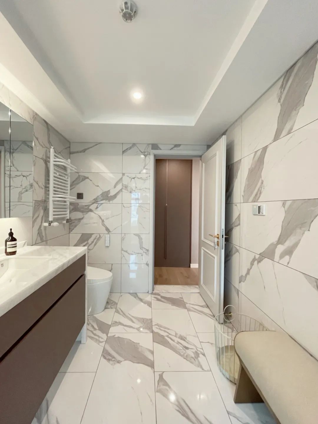 主卧内独立的卫生间功能齐全、私密有度、布局清晰合理,从细微之处提升居住者对品质生活的追求。主卫内设有一个椭圆形的浴缸,在墙面大理石纹理的映衬下更显高级,浴缸一侧墙面设计有壁龛,可以轻松收纳洗浴用品,还不占空间。夜晚归家,在水汽缭绕中,放松身心,窗外就是触手可及的江边美景,一天的疲惫在这里全然褪去。