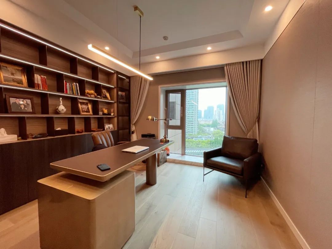 独立书房是每个成年人的梦想,本案业主就拥有一间空间充足的独立书房。整面的开放式书架既可以收纳主人的书籍,也可以摆放装饰品、照片等作为一个展示空间,复古的木质柜体与现代简约的装配式墙面也实现了完美的融合,低调又不失雅致。这样一个独立、静谧的空间,夜晚加班也不会再打扰爱人的梦乡了。