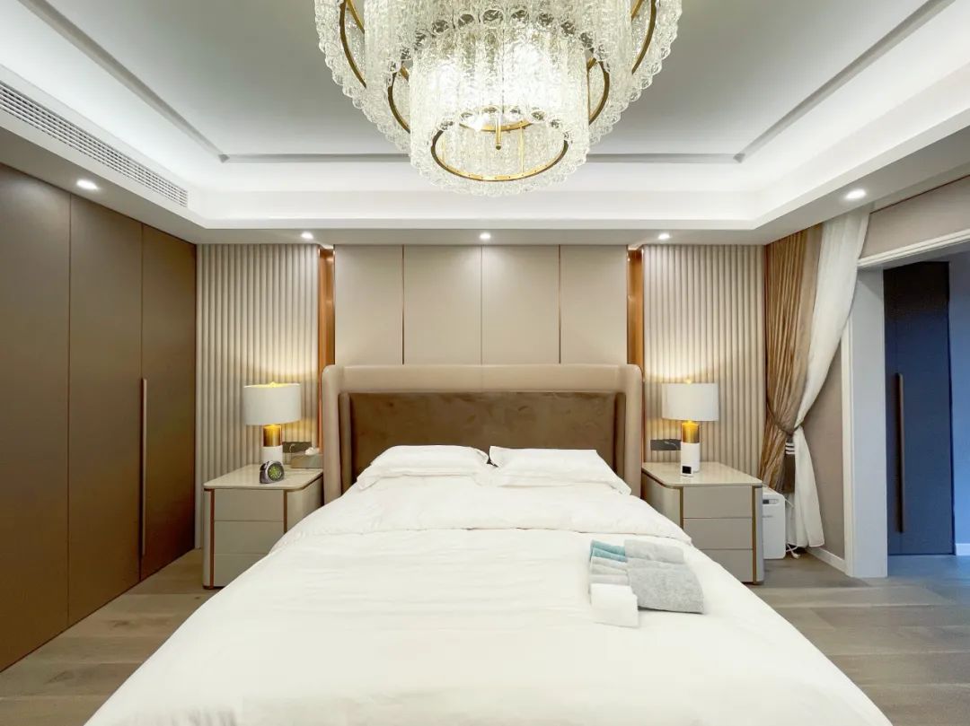 在越来越讲究“生活私密、品质享受”的当代,卧室除了满足基本的睡眠功能之外,也是主人的私人活动空间。本案主卧采用的是套房式设计,除睡眠区外,还配备步入式衣帽间和独立卫浴间,充分满足业主夫妻俩的起居需求。色彩设计上以大面积清雅的米白色墙面搭配金色的线条勾勒,配合质感高级的棕色系软装,营造出舒适典雅的居住氛围。