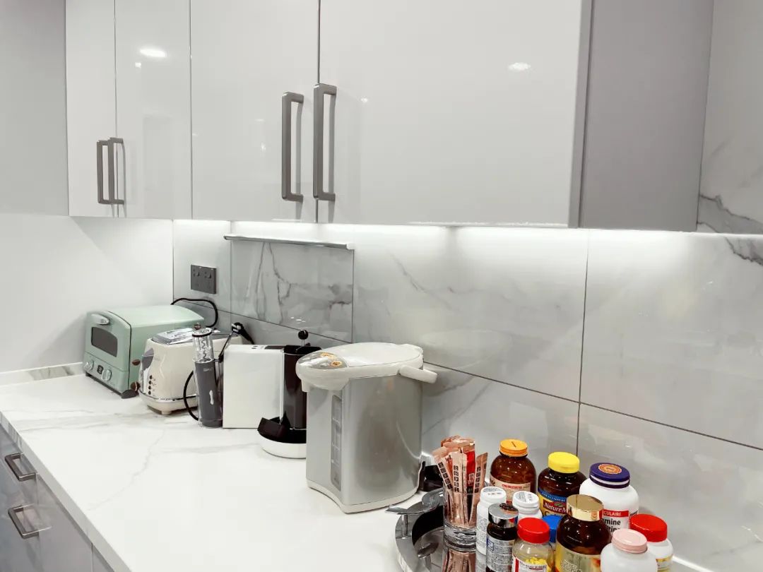 一字型的厨房空间两侧均设有烹饪操作台和上下组合式收纳柜,无论是做中餐、西餐都有充足的空间能够大展身手,一家人一起做饭也不会拥挤。操作台台面与墙面采用的是白色大理石材质,不仅清新美观也更加易于清洁。