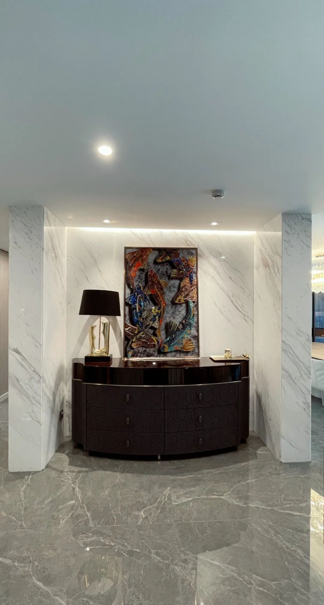 本案在玄关空间的墙面、地面采用了大面积的大理石材质设计,自然流畅的纹理、精致华贵的质感、低调简约的灰白色彩让玄关空间呈现出满满的高级感。同时玄关采用了半身高极简玄关柜,充足的空间能够满足出入户的收纳需求,纯黑柜体镶嵌金属条的设计与充满艺术气息的装饰画的搭配让更显高贵、优雅气质。