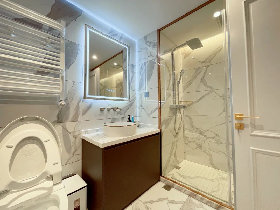 公共卫生间采用的是干湿分离的设计,以玻璃门将淋浴区与盥洗区、马桶区分离,提升了空间的利用效率。这样的设计方式也保证了干区的卫生情况不受湿区影响,更易清洁,化妆品、护肤品也避免受潮。