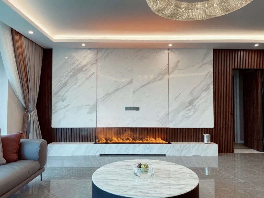 客厅墙面采用了悬空式主题背景墙,纯净自然的大理石纹理与深木色长城板的融合丰富了墙面的层次感,除了提升空间美观度外后期也可以根据需求安装电视变身电视墙,中间镂空台面也可以摆放一些日常用品,实用性更强。